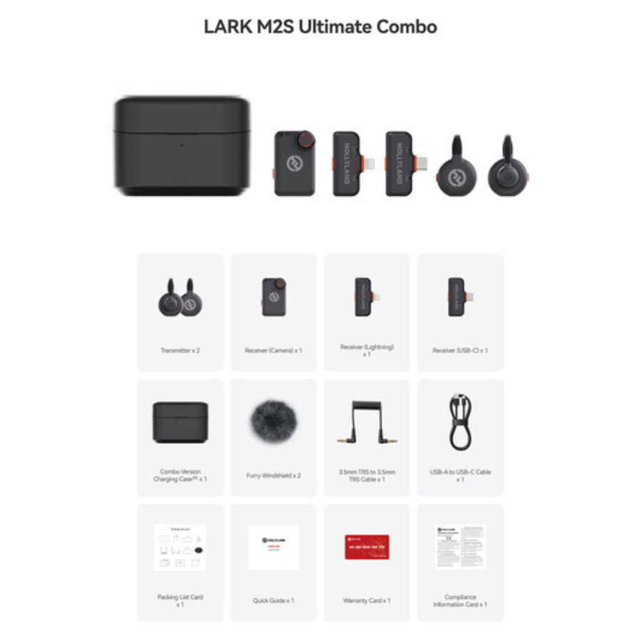 Grave até duas pessoas em aplicações de jornalismo móvel ou criação de conteúdo usando o Sistema de Microfone Sem Fio LARK M2S Ultimate Combo da Hollyland . O sistema inclui dois transmissores ultracompactos com microfones omnidirecionais integrados para gravação discreta, receptores com conectores USB-C e Lightning para conexão direta com dispositivos móveis, um receptor para montagem em câmera e um estojo de carregamento. Os transmissores possuem um design com clipe de titânio para fixação segura no entrevistado e não apresentam logotipos visíveis, garantindo um visual discreto.