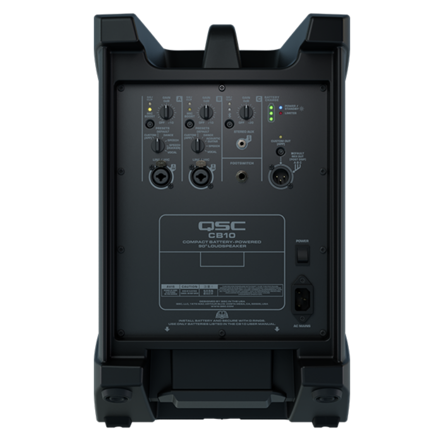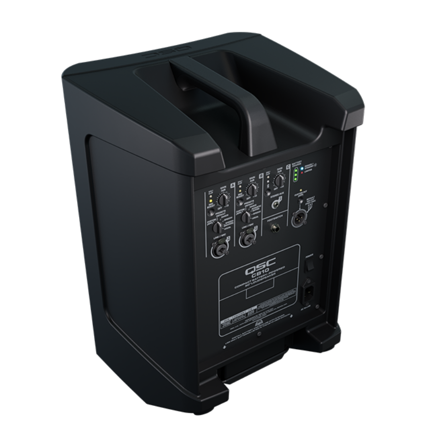 O modelo conta com Bluetooth 5.1, permitindo controle remoto pelo aplicativo QSC Loudspeaker Control e conexão True Wireless com uma segunda unidade CB10, sendo uma excelente escolha para DJs. Também oferece até 200 ms de atraso para ajuste de ambiente e melhor distribuição do som. Seu design com ângulo inclinado facilita o posicionamento no chão e proporciona cobertura sonora ideal, além de ser compatível com montagem em pedestal. A bateria recarregável integrada assegura funcionamento prolongado em qualquer lugar, e também é possível utilizar alimentação CA quando houver acesso à rede elétrica.