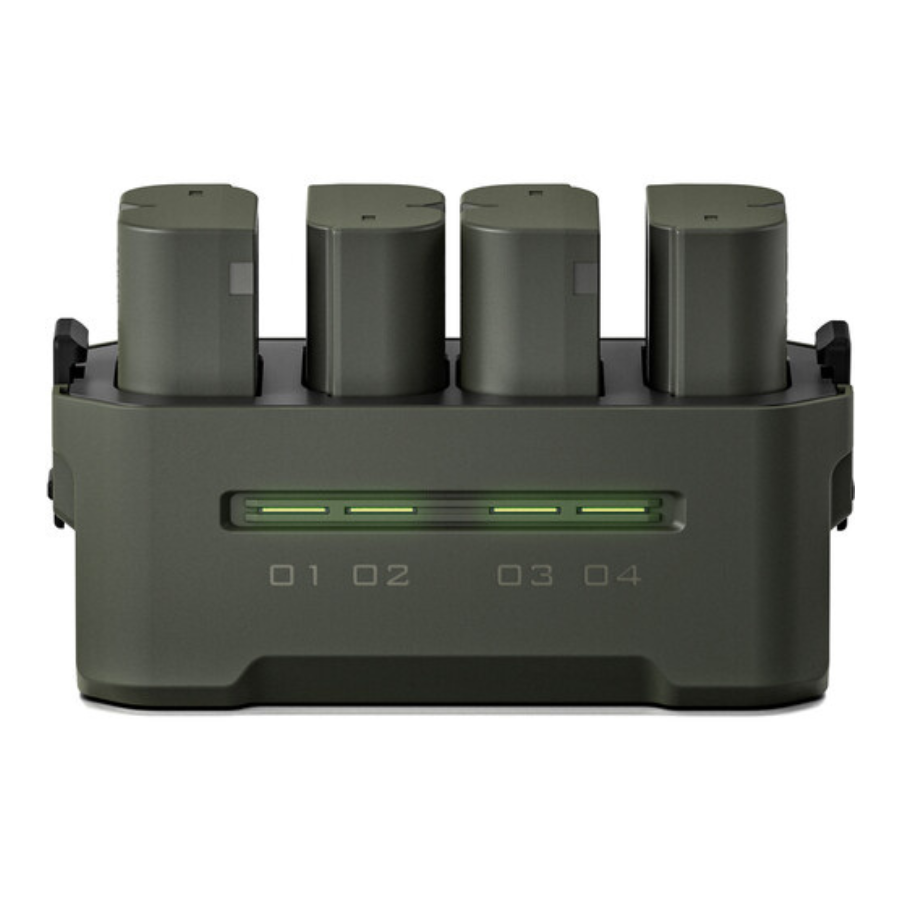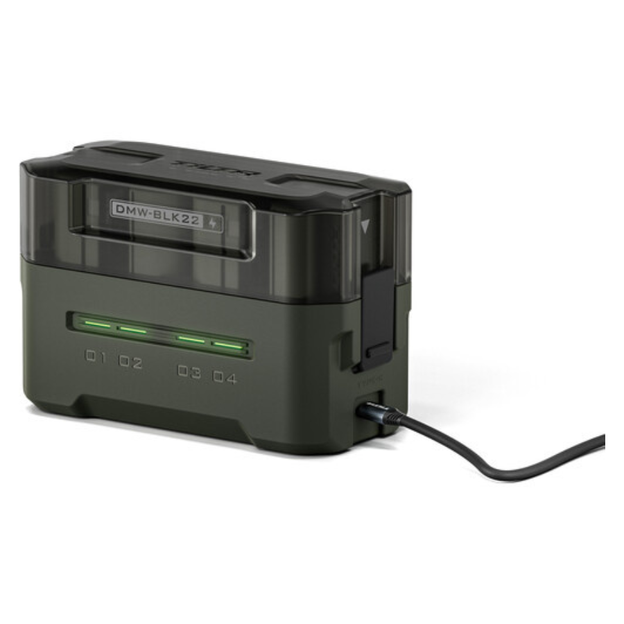 Este kit DMW-BLK22 da Tilta vem com quatro baterias recarregáveis Tilta DMW-BLK22, uma base de carregamento e um cabo USB-C.A estação de carregamento portátil requer um adaptador de energia (vendido separadamente) com pelo menos 45 W de potência para atingir os tempos de carregamento rápido mais velozes.