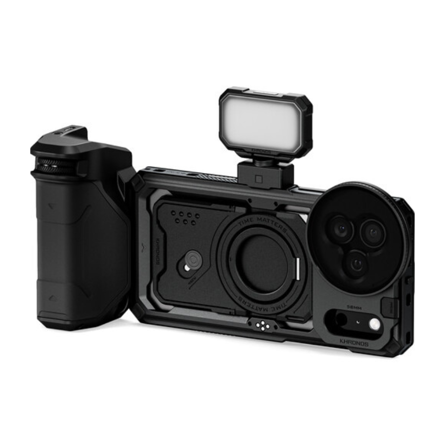 O kit Khronos Street Snap para iPhone 17 Pro Max da Tilta traz uma capa inspirada em gaiolas de câmera, unindo proteção, praticidade e um visual elegante. O conjunto inclui o suporte Focus PD para iPhone, a capa para iPhone 17 Pro Max, um painel de LED com luz balanceada para o dia e três níveis de brilho, além de um filtro combinado Polarizador/Black Mist 1/2.