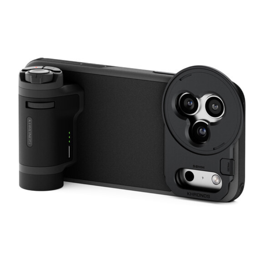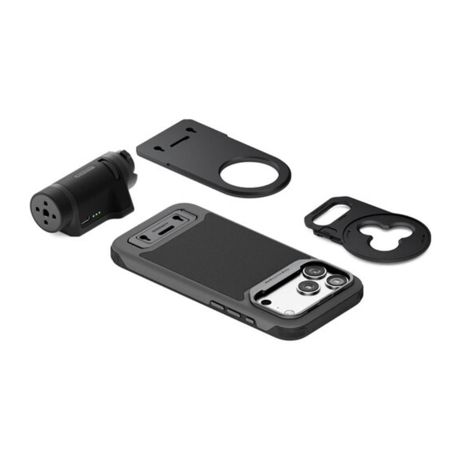 O kit portátil Khronos Lite para iPhone 17 Pro da Tilta inclui a capa Khronos Lite para iPhone 17, uma bandeja magnética para filtros de 58 mm, a alça de controle Lite para iPhone e uma placa traseira magnética universal. Além de proteger o iPhone, a capa funciona como uma base prática para montagem de acessórios. A alça de controle permite ajustar o foco da câmera com mais precisão, enquanto a placa traseira magnética se fixa à parte de trás da capa, criando uma superfície de encaixe para diversos acessórios vendidos separadamente, como porta-cartões, luz LED, SSD, power bank e muito mais.