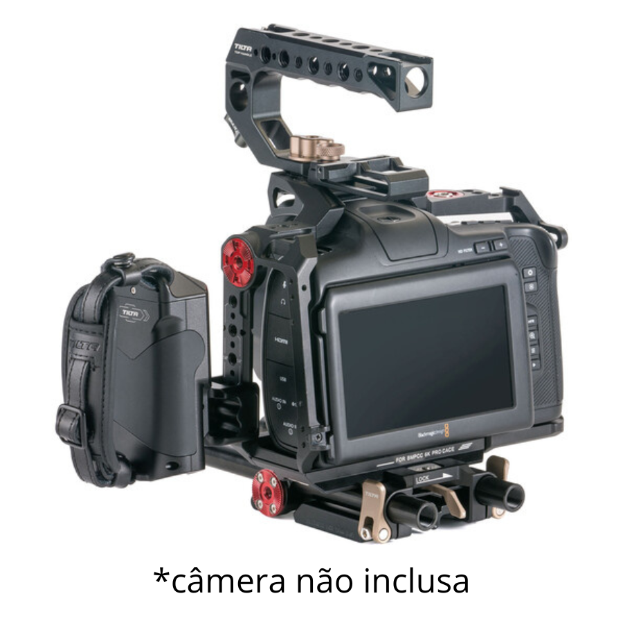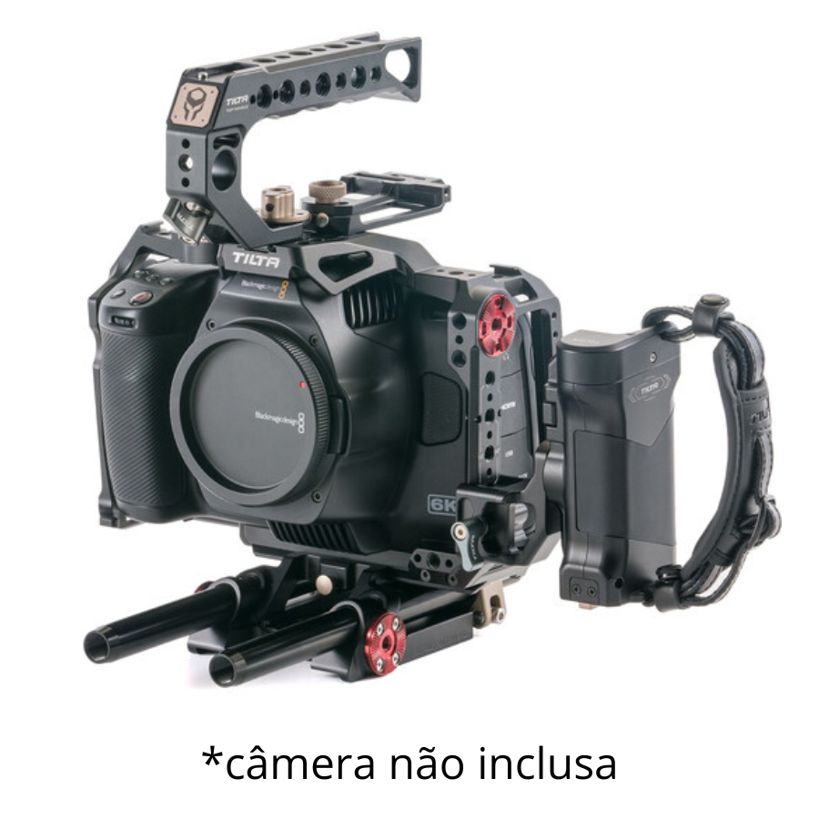 O kit de gaiola avançada da Tilta para as câmeras BMPCC 6K Pro e 6K G2 reúne uma gaiola de proteção completa e um sistema de placa de base LWS de 15 mm, acompanhado de duas hastes de 30 cm para a montagem de acessórios. Além disso, o kit inclui vários complementos que ampliam a versatilidade do conjunto, como uma alça lateral com função de iniciar/parar gravação e cabo, uma alça superior com liberação rápida, suporte para SSD Samsung T5, suporte para o punho de bateria da Blackmagic 6K Pro e um cabo USB-C em ângulo de 90°.